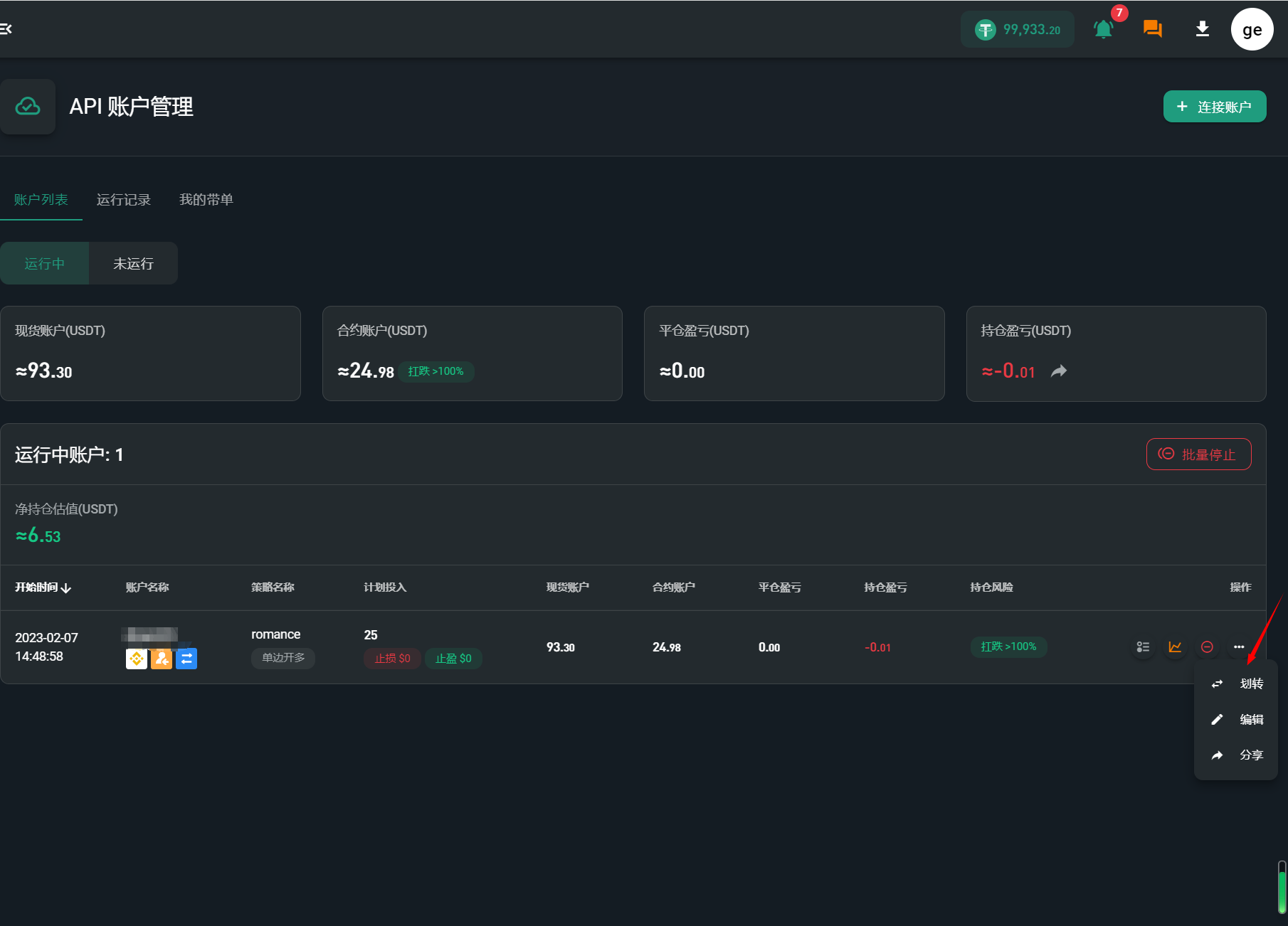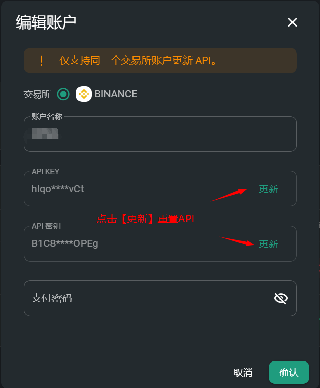 * 平台支持在不停止策略运行的情况下更新交易所账户 API，如 API 即将到期或因为安全原因需要更换 API，可以直接点击账户【编辑】-【更新】，更新成功后，可以将原 API 删除；