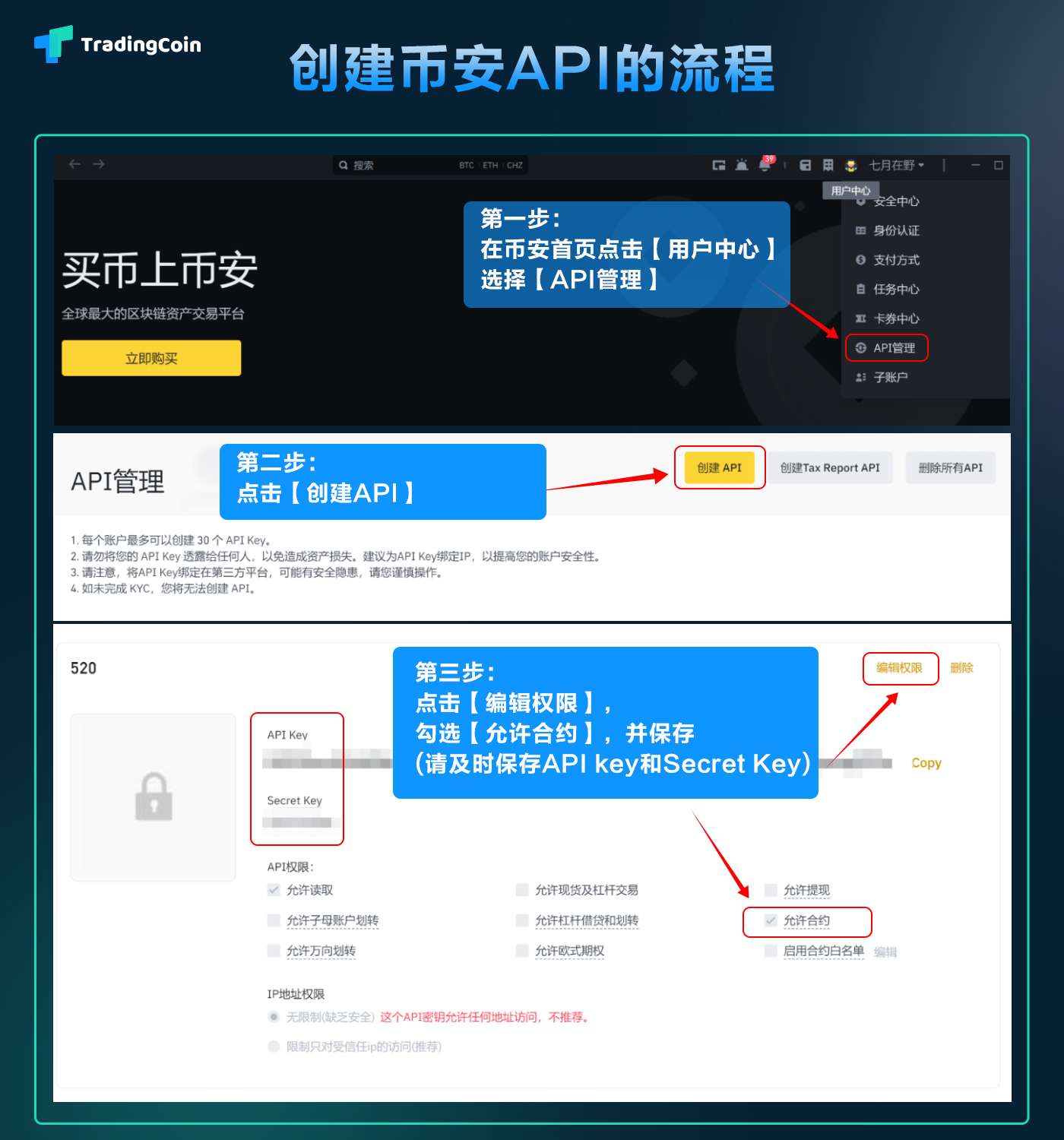 <mark style="color:red;">注意：创建API需要有币安资产，充值后方可创建）；设置API key权限 ，供TradingCoin智能投顾平台使用的API key，只需具备【允许合约】权限， 为了避免API key泄露导致的资金安全问题，请勿勾选【允许提现】权限。</mark>